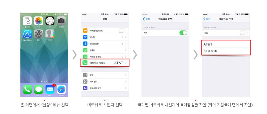 iOS 설정 > 네트워크 사업자 > 국가별 네트워크 사업자 선택